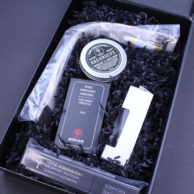 The Shaving Set is supplied in a tissue lined cardboard box printed with the Boker logo.