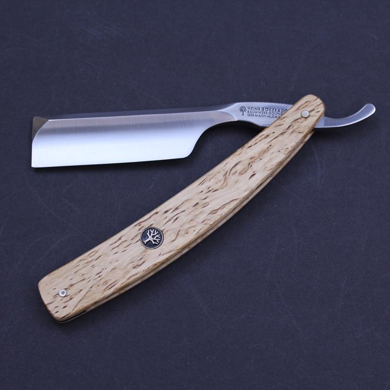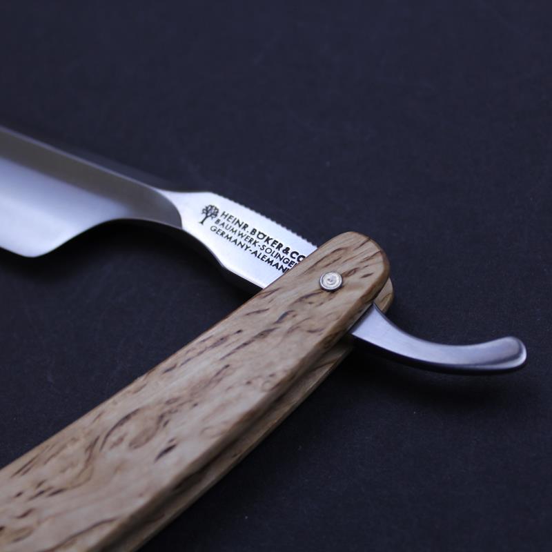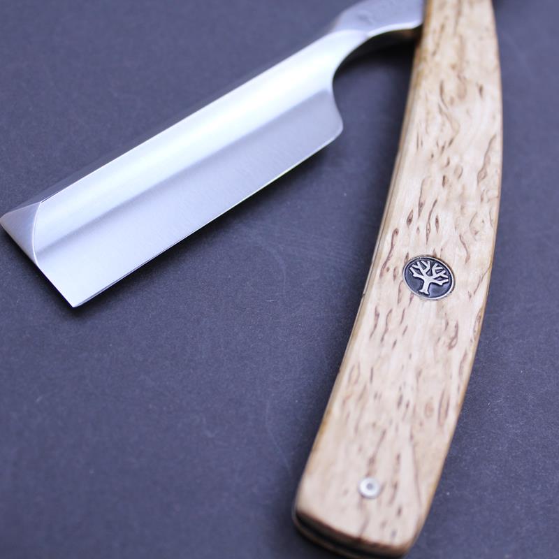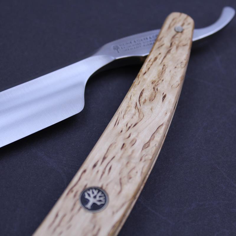 The Celebrated Curly Birch Razor from Boker is part of a series which includes The Celebrated Wenge. The scales are made from a wood called curly birch, which is similar to silver birch but which has a genetic defect that causes the tree to twist on the stem with curls. It is a dense and robust wood which means it is particularly suitable for knife handles and in this case razor scales. The graining and appearance of the scales will vary from one razor to another.