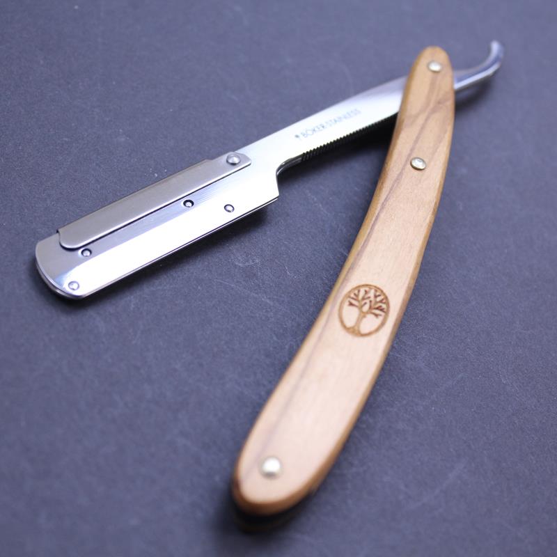 Boker say the Boker Pro Razette combines professional functionality, a familiar grip and balance and the authentic aesthetics of a classic straight razor. If you are just starting out, it is an alternative to a traditional straight razor at a much lower price point. The olivewood handles bear the Boker tree logo.