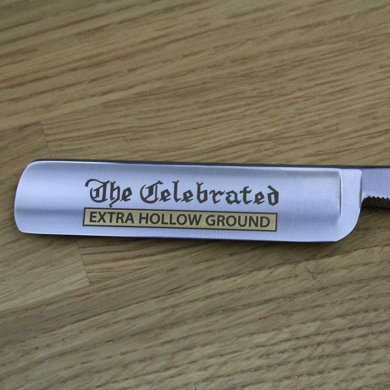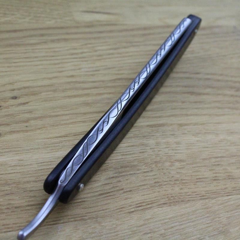 A new design from Boker this 5/8 razor certainly has a distinctive look. It has a satin finish to the carbon steel blade with an interesting curlicue design etched all along the spine, jimping to the lower tang and a decorated blade with the words “The Celebrated” and “Extra Hollow Ground”. The scales are made from ebony, a robust but attractive wood with the Boker tree design etched into the sclaes on one side.