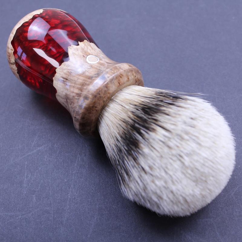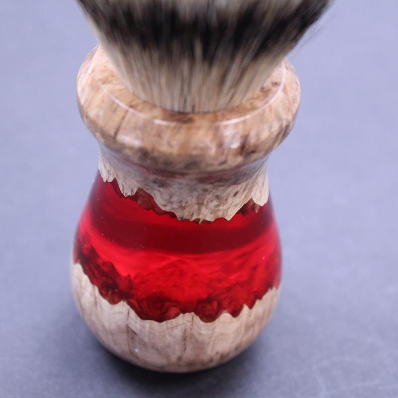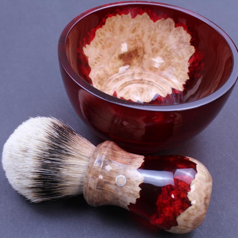 This hand made burl wood and resin shave brush and bowl set is part of our “Silver Ring” range, exclusive to The Invisible Edge. Malle burl wood, a wood native to Australia and part of the eucalyptus family is cleverly combined with resin, in this case red in colour, to produce this totally unique shave brush and bowl set. The bowl has concentric circles moulded in the base which helps to introduce air into your shave soap or cream to produce a thicker lather. The mix of burl wood and resin always produces different shapes and patterns in the brush handle which can be seen in the photos.  The brush has a loft of silvertip badger hair.