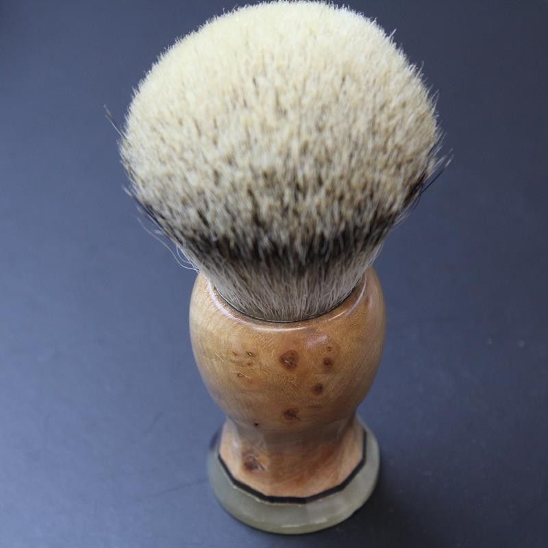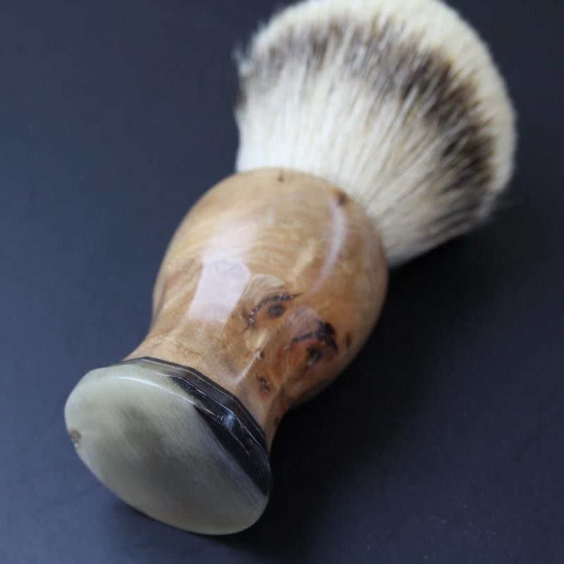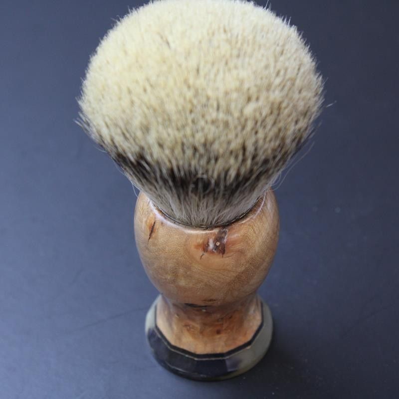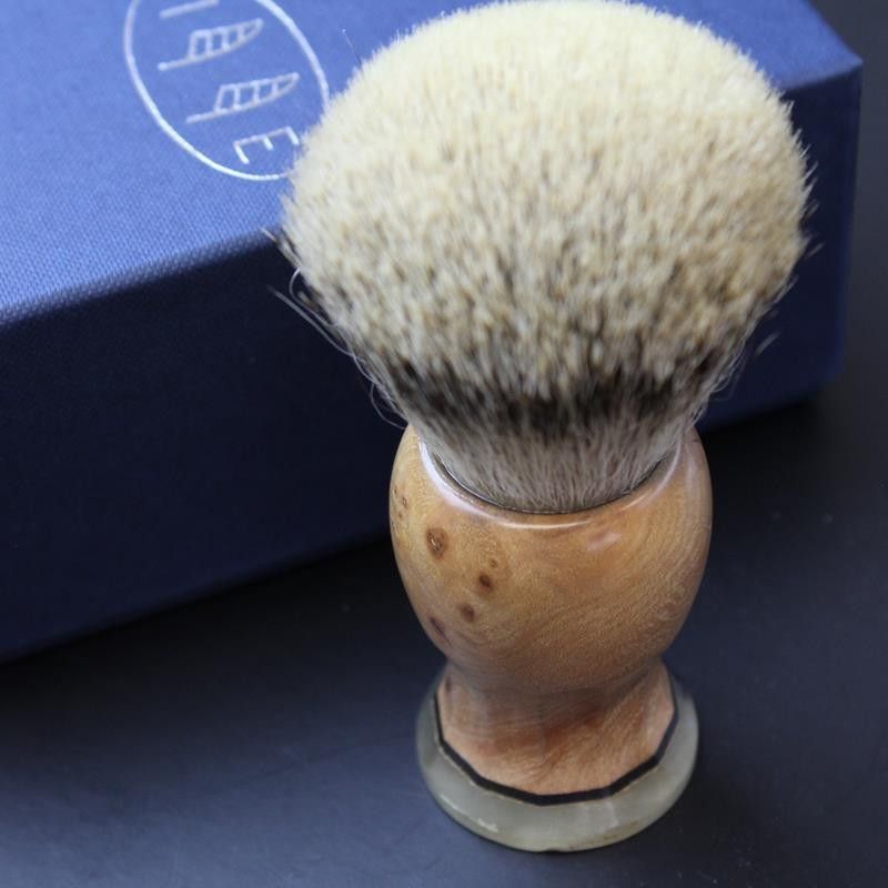 We have managed to source more brushes to add to our Invisible Edge Custom Brush range. This one has a handle made from Burr Elm. Mature elm trees often exhibit burrs on the trunk and large branches. These abnormal growths produce a wood that is wonderfully spotty and swirly in character which is much admired. The wood grain on the handle of this brush is an interesting mix of knots and whirls and is a lovely example of Burr Elm wood. The base is made from a piece of blonde horn which sets off the brush beautifully. Individually hand made in England with finest silvertip badger hair. Supplied in a high quality satin lined box.