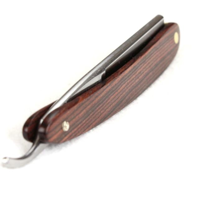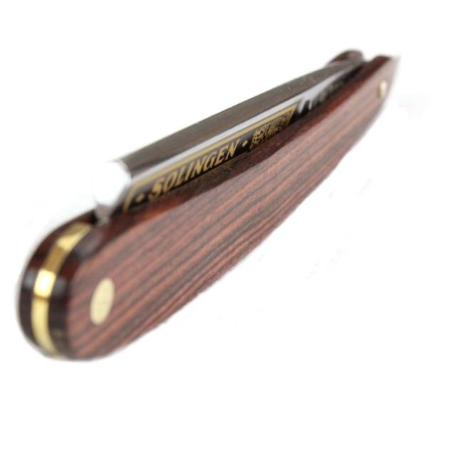 Dovo’s Prima Klang razors have a 5/8 extra hollow ground blade from carbon steel. This variant has violetwood scales which have a straight grain and a hint of red to the mid-brown colouring, set off by a brass heel pin and spacer. The spine is plain. The blade has a goldwash Solingen mark, making for a very attractive razor.