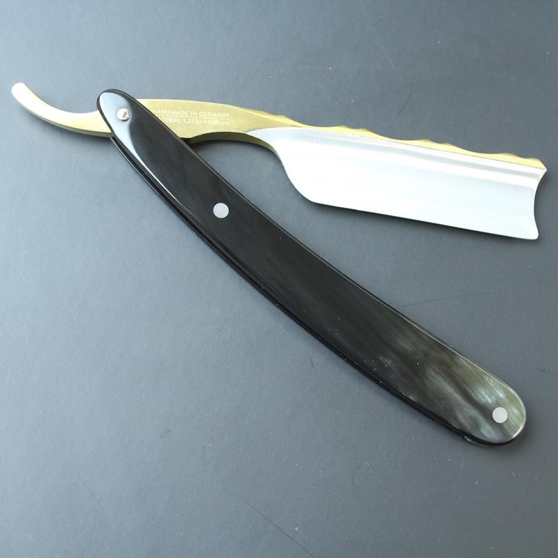 The Dovo Bergischer Löwe is, understandably, a very sought after razor. This version is a 6/8 size set off with wonderful buffalo horn scales. The Swedish steel blade is shoulderless and etched with a spike point. It has a gold wash both to the tang and spine decoration.