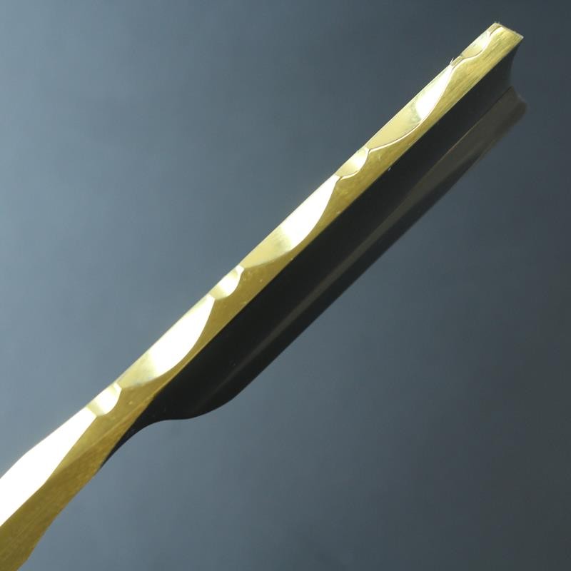 The Dovo Bergischer Löwe is, understandably, a very sought after razor. This version is a 6/8 size set off with wonderful buffalo horn scales which have a third pin for additional support. The Swedish steel blade is shoulderless and etched with a spike point. It has a gold wash both to the tang and spine decoration.