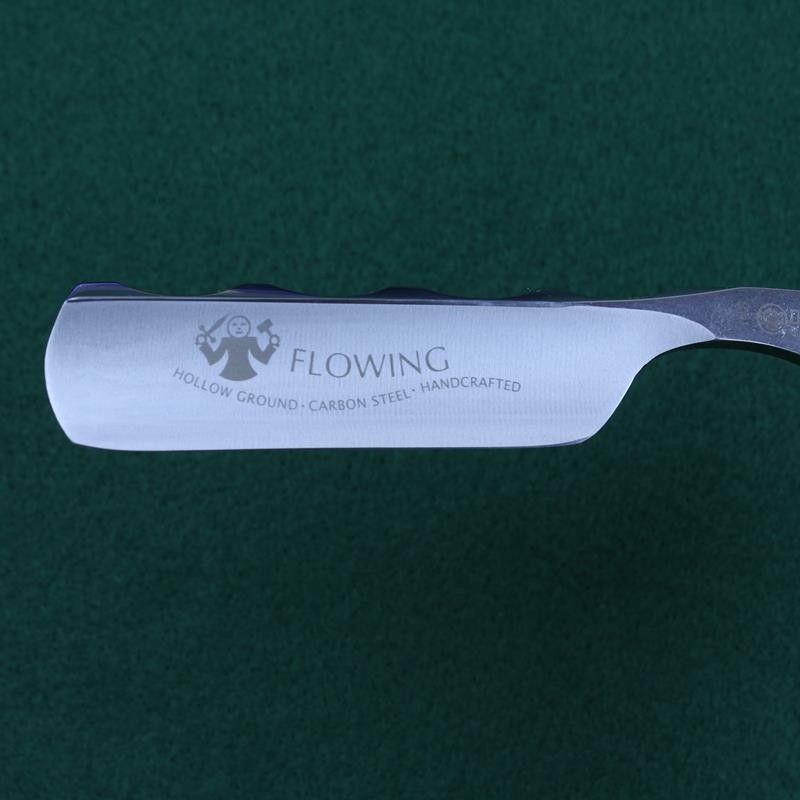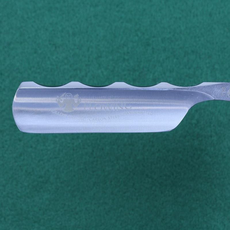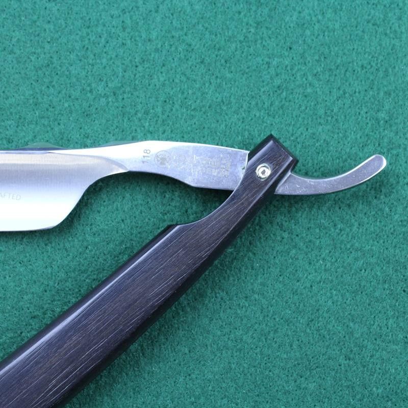 This stunning razor is the new version of the Dovo 6/8 Flowing razor. It has the same full hollow carbon blade with the same unusual scalloped spine but this razor has ebony scales. These again have the same unusual curved design with two heel pins and double scallop cutouts. A slightly different take on a classic razor.