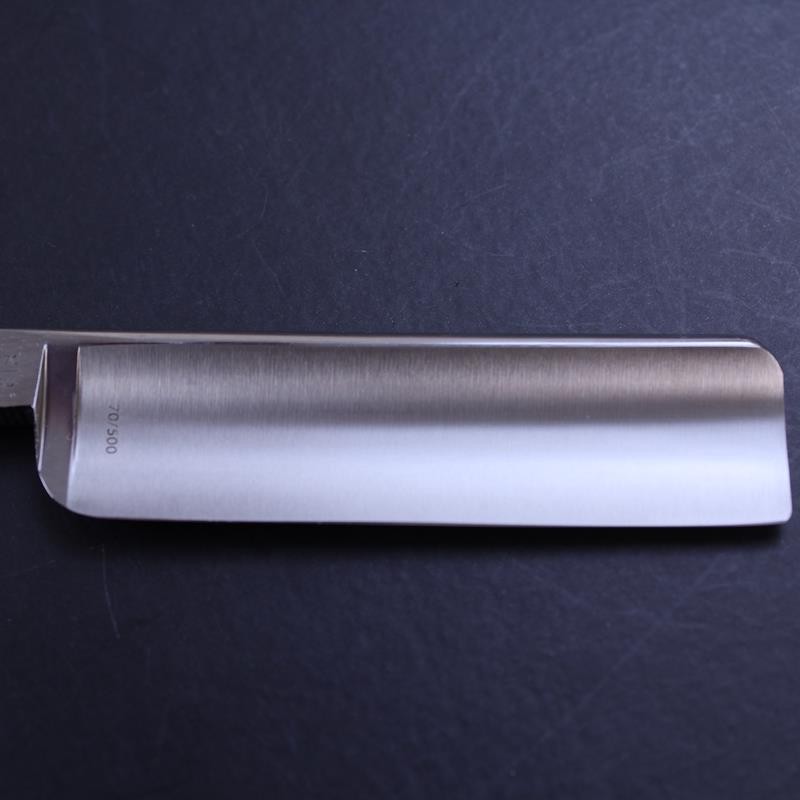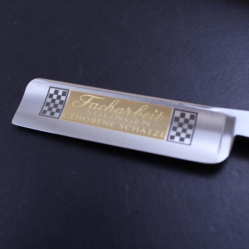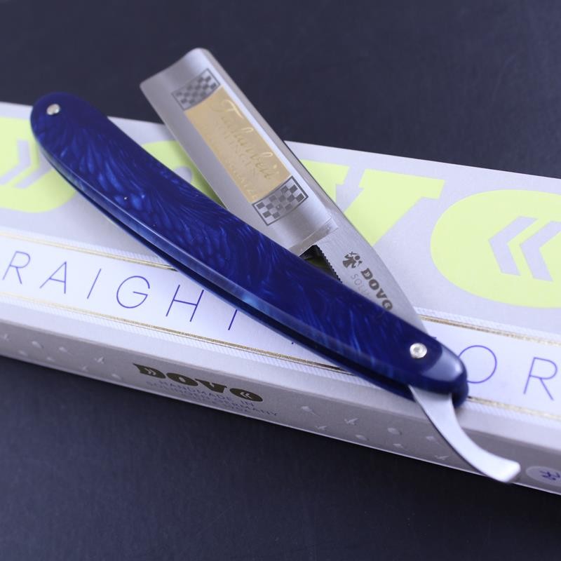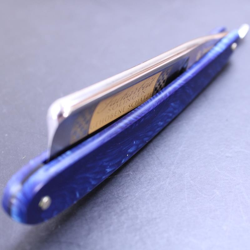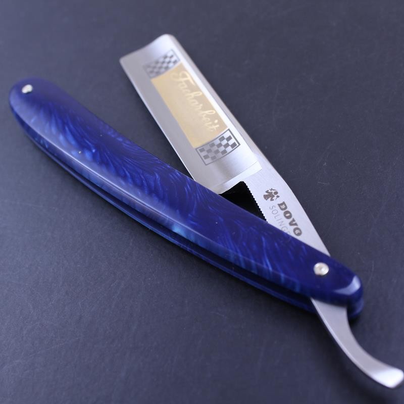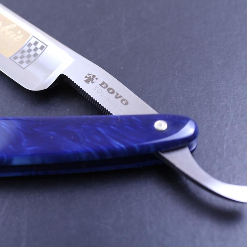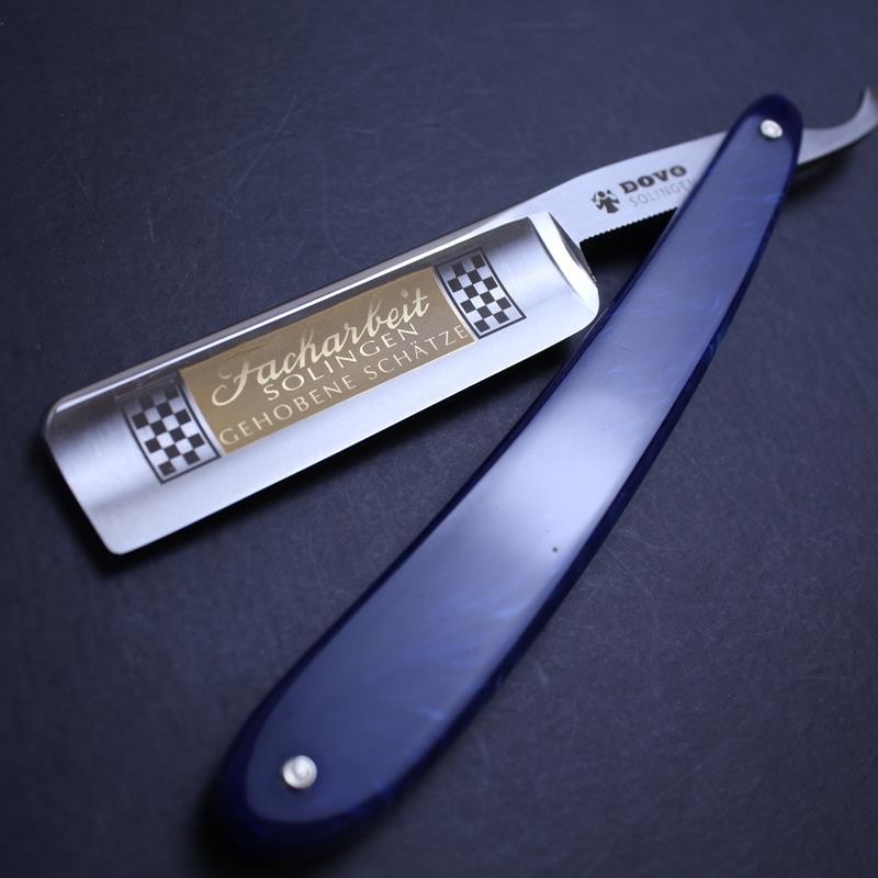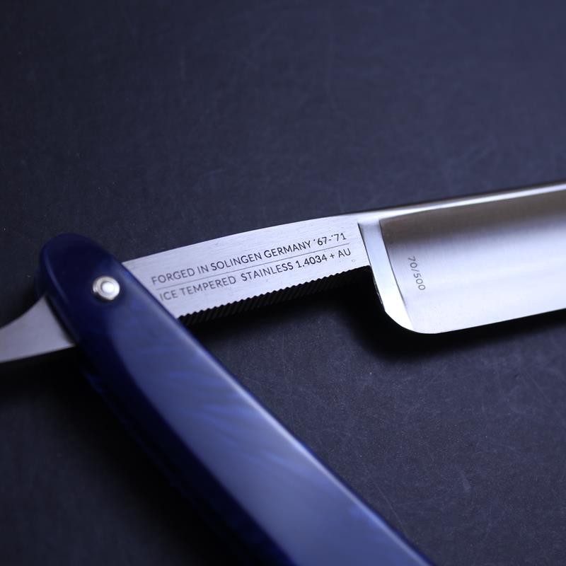 The ice tempered stainless steel blades for these razors were forged by DOVO in 1967 but never used. They were recently discovered, ground and given a modern twist with the addition of acrylic handles. This is the blue variant, and these razors are also available in red. The razors have jimping to the lower tang, a plain spine and are engraved with an individual serial number. Each colour variant is limited to 500 pieces and we have 6 of each colour in stock bearing the serial numbers 68 to 73 inclusive. “Facharbeit” translates literally as “skilled work”.