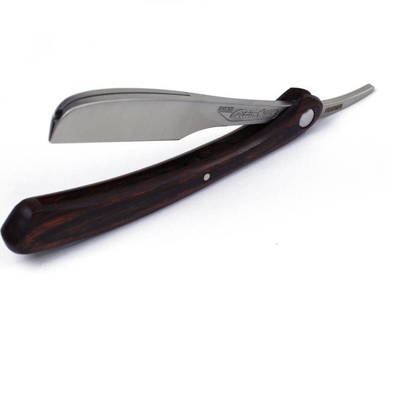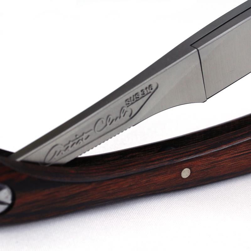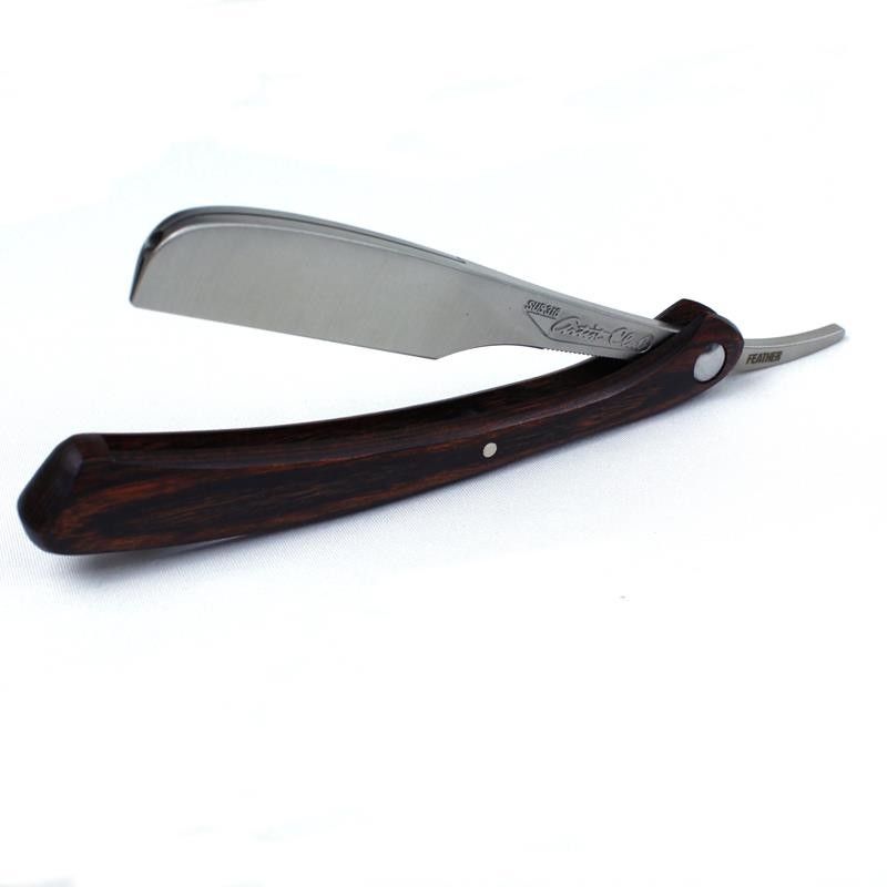 This Feather razor is at the top of the range amongst the excellent Artist Club series. Made in Japan, the razor takes replaceable blades to ensure a sharp edge for every shave and without the need to strop or hone the razor as is normally required with shaving with a straight razor. This model has a beautiful dark wood handle. The blade holder is made from stainless steel.