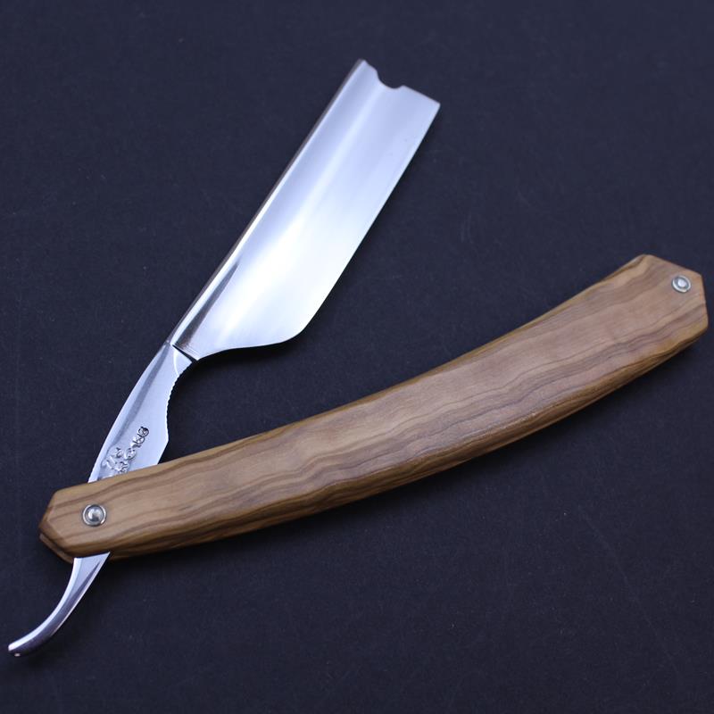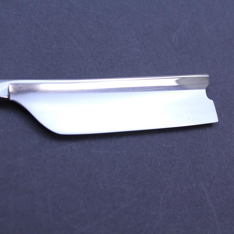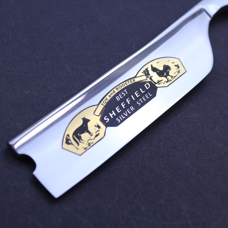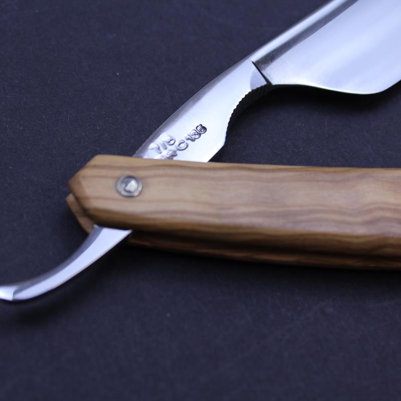 The blade of this Fox and Rooster razor with olivewood scales is mirror polished on both sides, with a plain spine and of a singing hollowed grind. There is jimping to both the upper and lower tang. The carbon steel blade has a hook nose which together with the larger sized blade means this razor is really suitable only for the more experienced straight razor enthusiast.