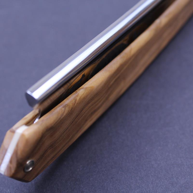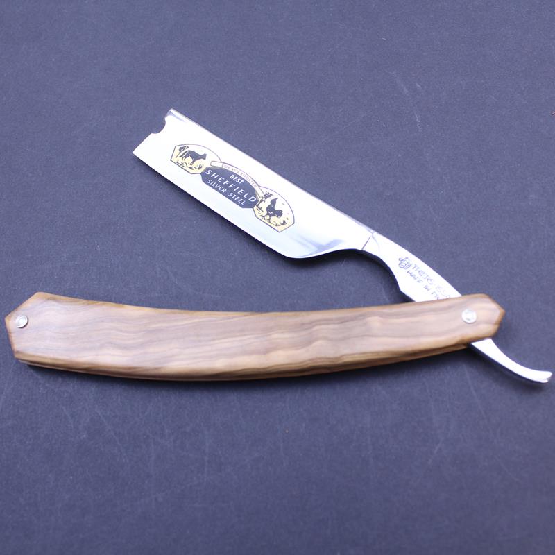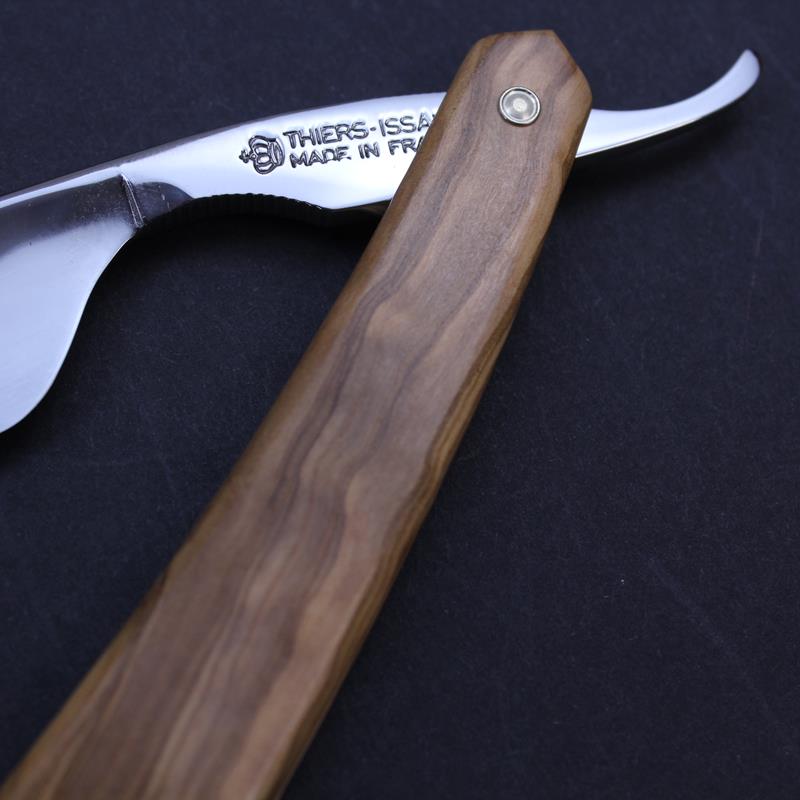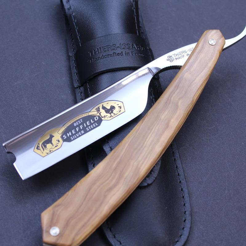 This Fox and Rooster razor with olivewood scales from Thiers Issard has a 7/8 blade with a blade marking in black and goldwash. Olivewood has a wonderful grain and the colouring of each piece is different so each razor is unique. This example has a beautiful stripe in the grain mixing honey colours with darker tones.