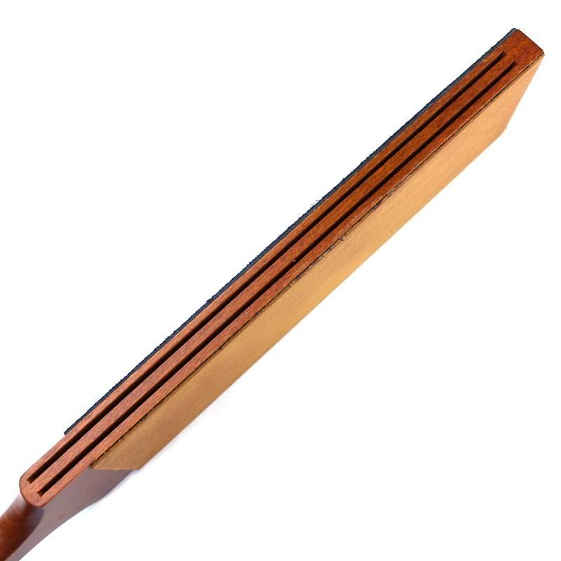 This is a new version of our very popular 3″ wide sprung-bed paddle strop. One side of this strop has a smooth side made from premium cowhide while the other is a napped leather with a sueded feel. While it may be used for finishing, this napped side is also ideal for use with a diamond or chromium oxide paste. This version gives you the option of finishing your stropping regime on a smooth leather surface rather than a textured one. Both version have the advantage of accommodating the whole edge of your straight razor making it easier for a beginner to use. While rigid, the strops have a degree of flex due to the hollowed centre. The colour of the strop beds may vary from that illustrated.