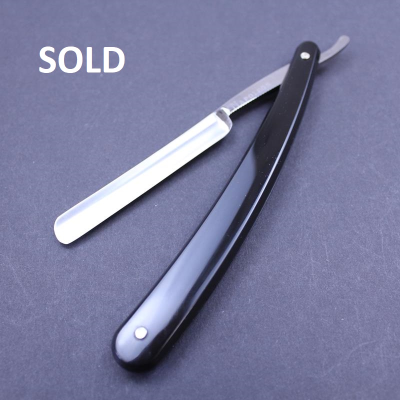 The razor has a thick grind, a round point and jimping to the upper and lower tang and black scales, which we believe to be Bakelite. The scales are larger than the blade so there is a gap between the point of the blade and the spacer in the scales. While the razors came to me in very good condition, the odd one had a bit of corrosion on the spine or tang which I have removed. If you are interested in a small Sheffield razor then this would be a great buy.