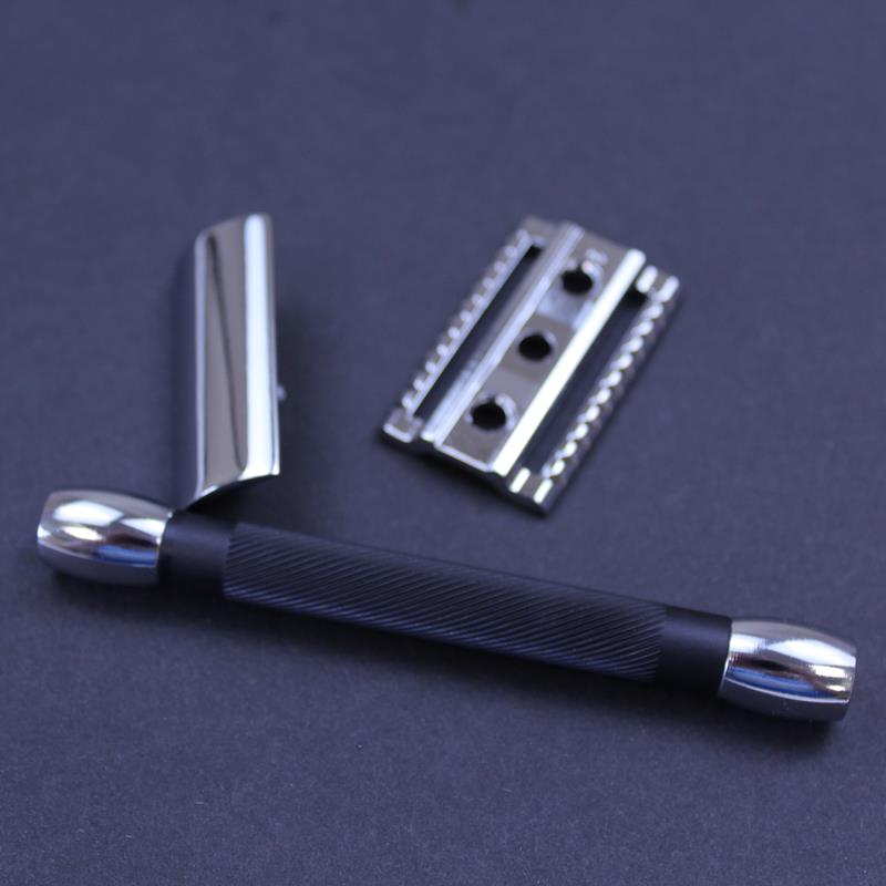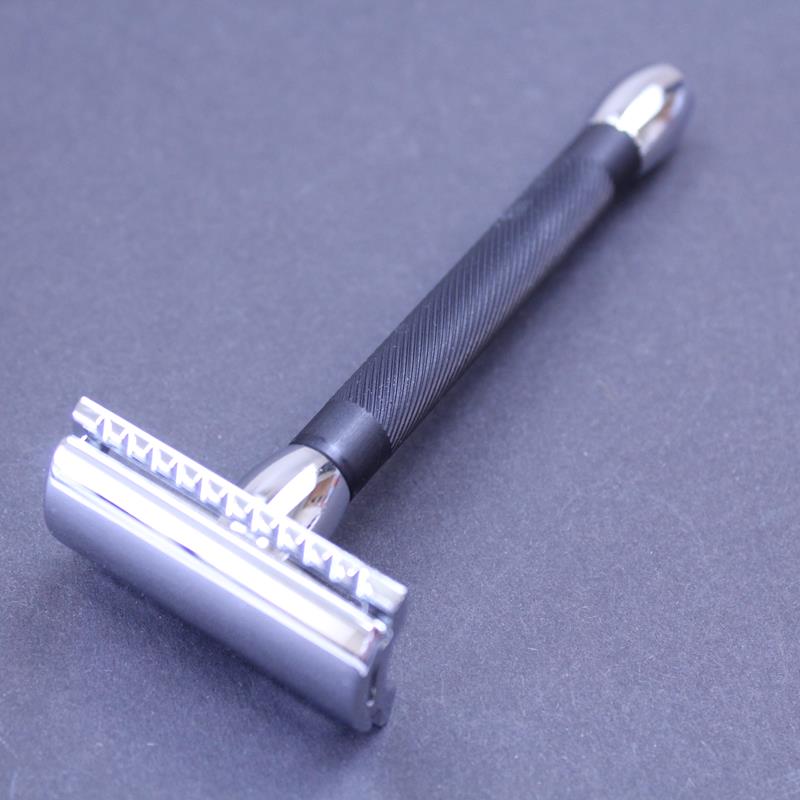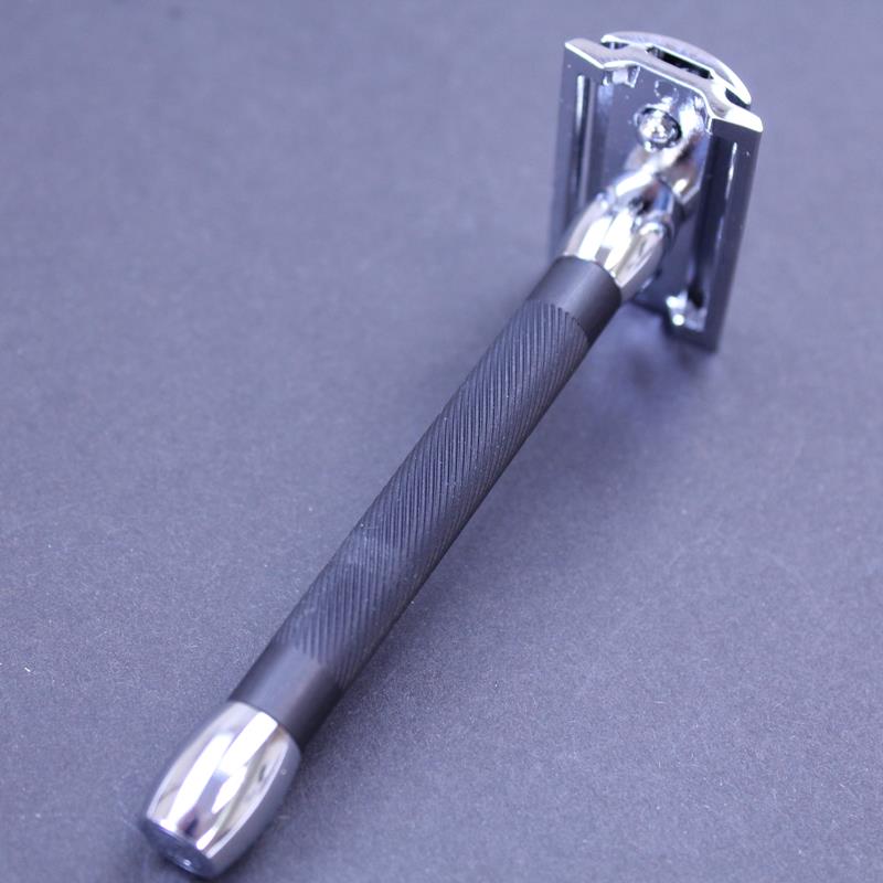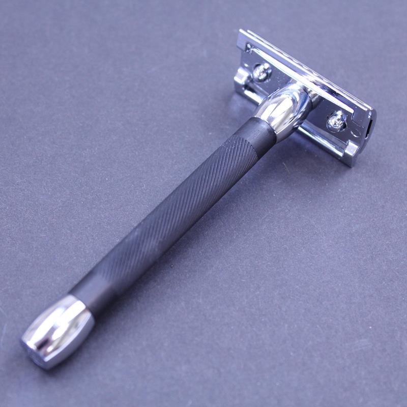 This Merkur 20C Long Handled Razor is a 3 piece razor which has a straight bar head and a closed comb so less skin is exposed to the blade. The 20C has a chrome plated head and a slightly longer contrasting matte black handle with deep spiral grooves which make a modern day look for a classic. It is slightly head heavy. Fans of the 20C razor rave about its balance and weight which makes for easy manoeuvring during shaving. The Merkur 20C is a 3 piece razor so the handle unscrews from the head piece for blade replacement. This razor accepts a standard DE razor blade.