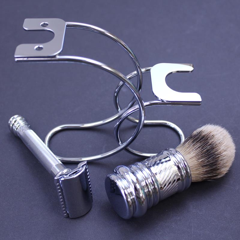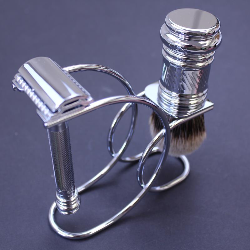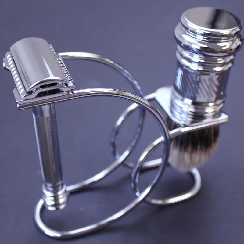 This stylish set comprises a chrome stand embossed with the Merkur logo, a pure badger brush with a chrome finish and “barbers pole” design to match the Merkur 38C razor also included.