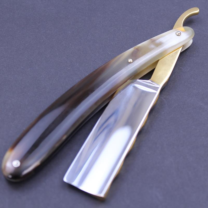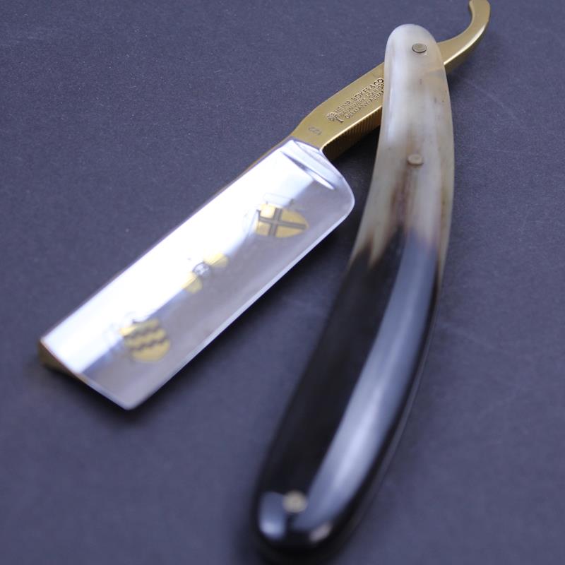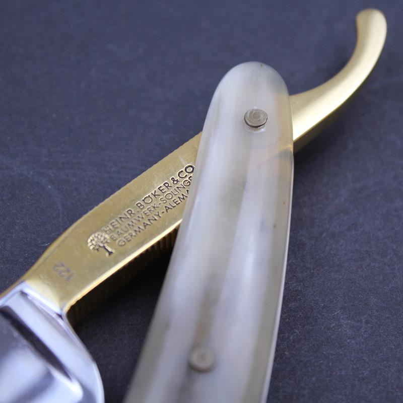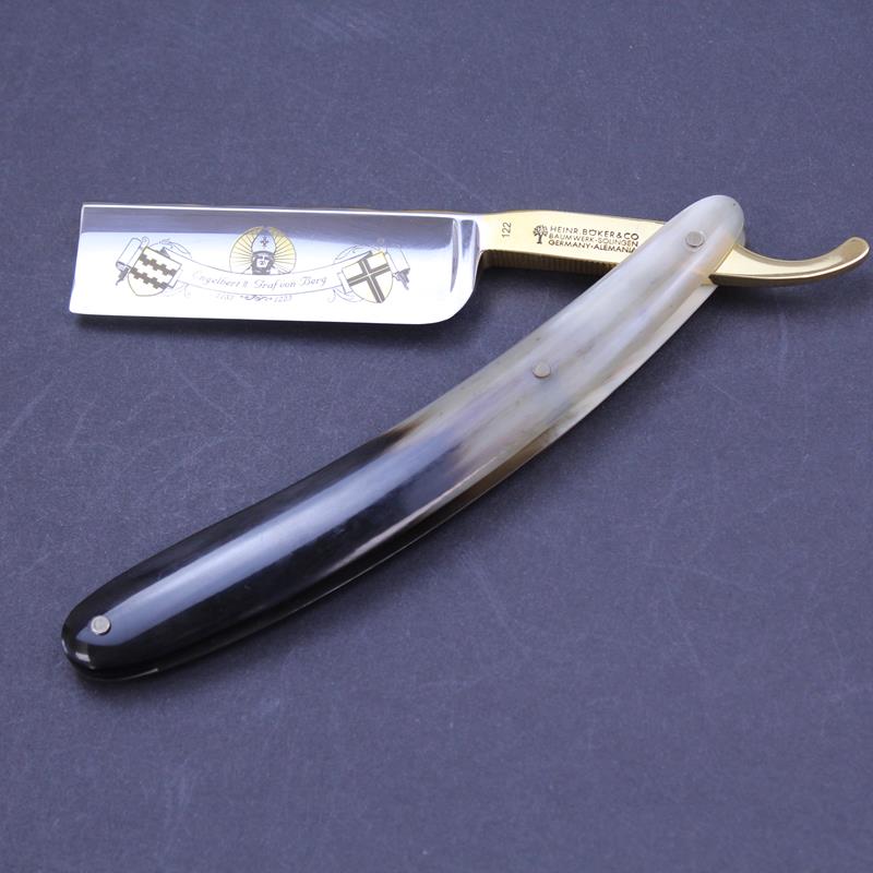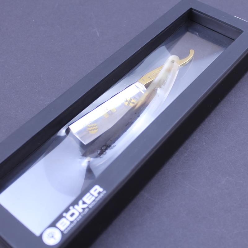 From a series of commemorative razors, this magnificent razor must be one of the highlights. The Boker Graf Engelbert is a square point razor with 7/8 blade, a mirror finish and embellished with 24 carat gold. The spine has a scalloped shape to it while there are jimps to both the upper and lower tang. The blade has an extra hollow grind with a blade stabiliser to provide rigidity.
