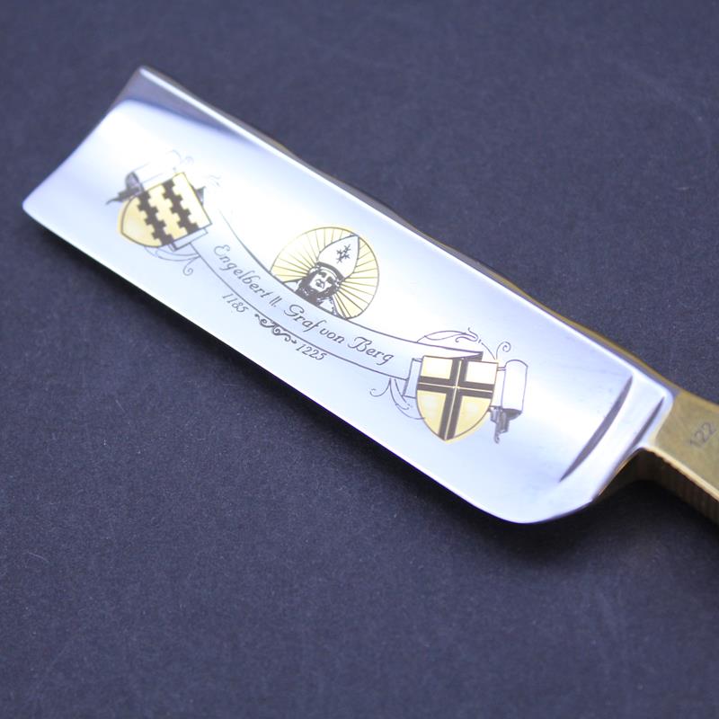 Near Boker’s headquarters lies the castle Burg an der Wupper. The castle is one of the largest in western Germany and the largest reconstructed castle in North Rhine-Westphalia. The famous history of Castle Burg is inseparably linked to the Duchy Berg and the Counts von Berg (Haus Berg 1068-1225). Boker have produced a series of straight razors dedicated to three historical Counts. This razor depicts the last Count von Berg, Engelbert II and represents him in his role as Archbishop of Cologne.