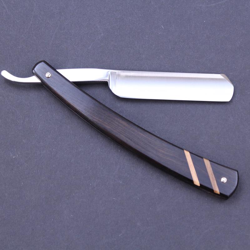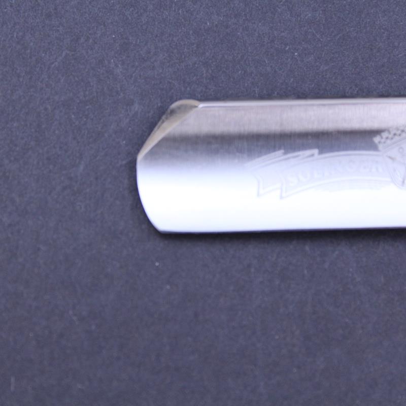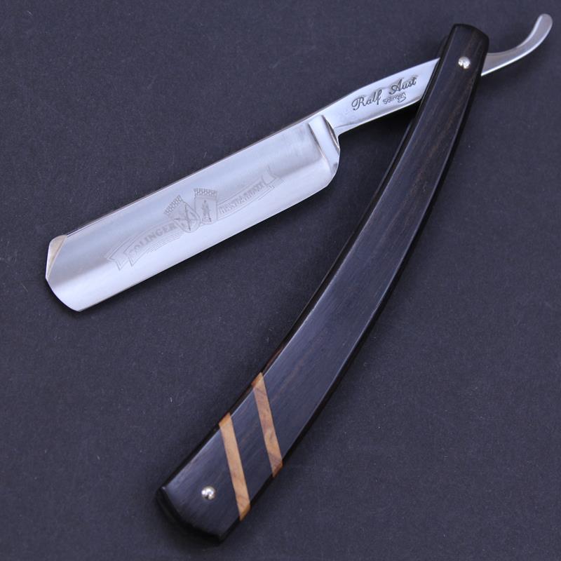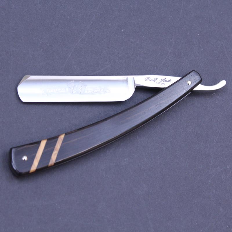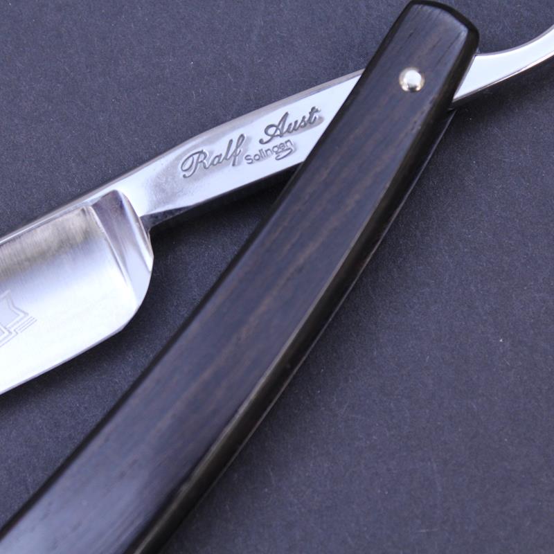 This stunning Ralf Aust razor has a 5/8 carbon steel blade with a satin finish, a round point and African blackwood scales. It has the usual “Ralf Aust Solingen” mark on the tang and the “Solingen Handarbeit” – handmade in Solingen – mark on the blade. This razor is similar to the razor with code IE280023, yet different in 2 subtle ways. Firstly the beautiful olivewood inlaid scales have a more contempoary shape and secondly, the spine has a champfered point, giving the round point a slightly more modern look.