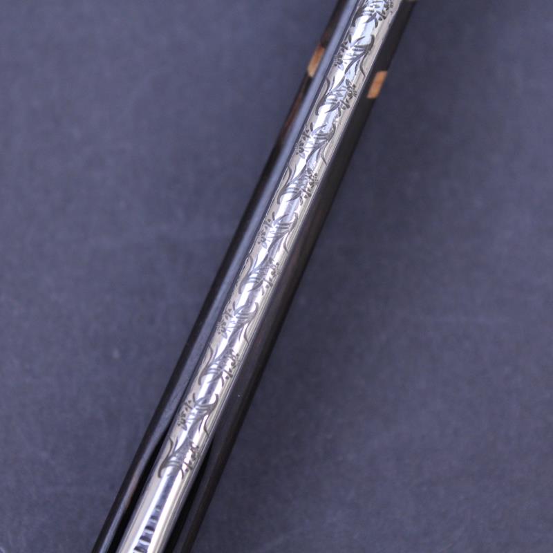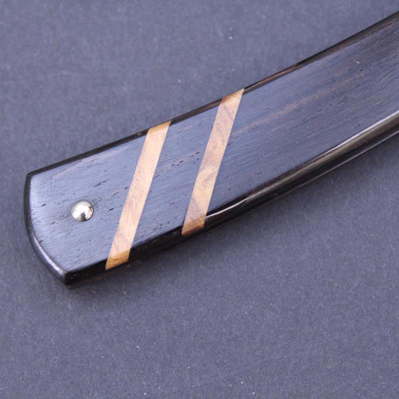 The African blackwood scales vary in colour from dark red to almost black and is a like a cross between cocobolo and ebony. This type of wood a good choice as it is robust and has water repellent properties which means that the scales will retain their appeal. But what makes these scales different from our other razors bearing african blackwood scales is the olivewood inlay which adds a beautiful contrast. The tang has jimping to both the upper and lower sides and the spine has a laser etched flower pattern to the top. All in all this goes to show that beautiful things do come in small sizes ! All Ralf Aust razors have a full hollow ground blade.