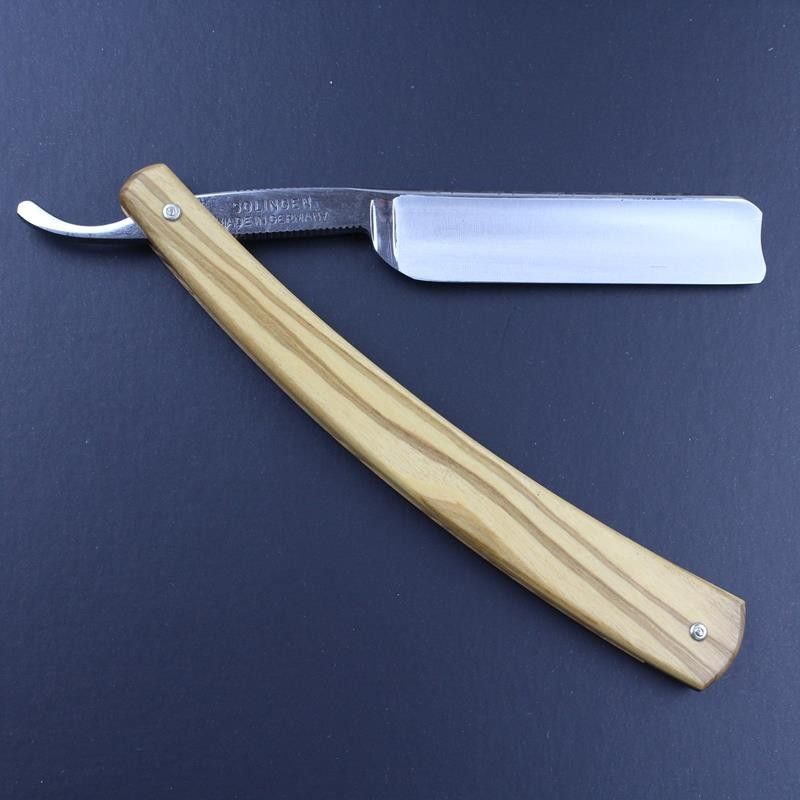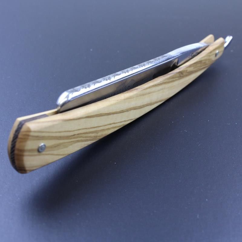 This Ralf Aust razor has a 5/8 carbon steel blade with satin finish, with jimping to the upper and lower tang. This version has a laser etched spine depicting stylised flowers. It has the “Ralf Aust Solingen” mark on the tang and the “Solinger Handarbeit” – handmade in Solingen – mark on the blade. The blade has a form of Spanish point to it, but it is slightly more of a wave shape than a crescent. The contemporary style scales are made from olivewood, a wood which has a beautiful grain to it. All together this is an elegant razor at a very reasonable price. All Ralf Aust razors have a full hollow ground blade.