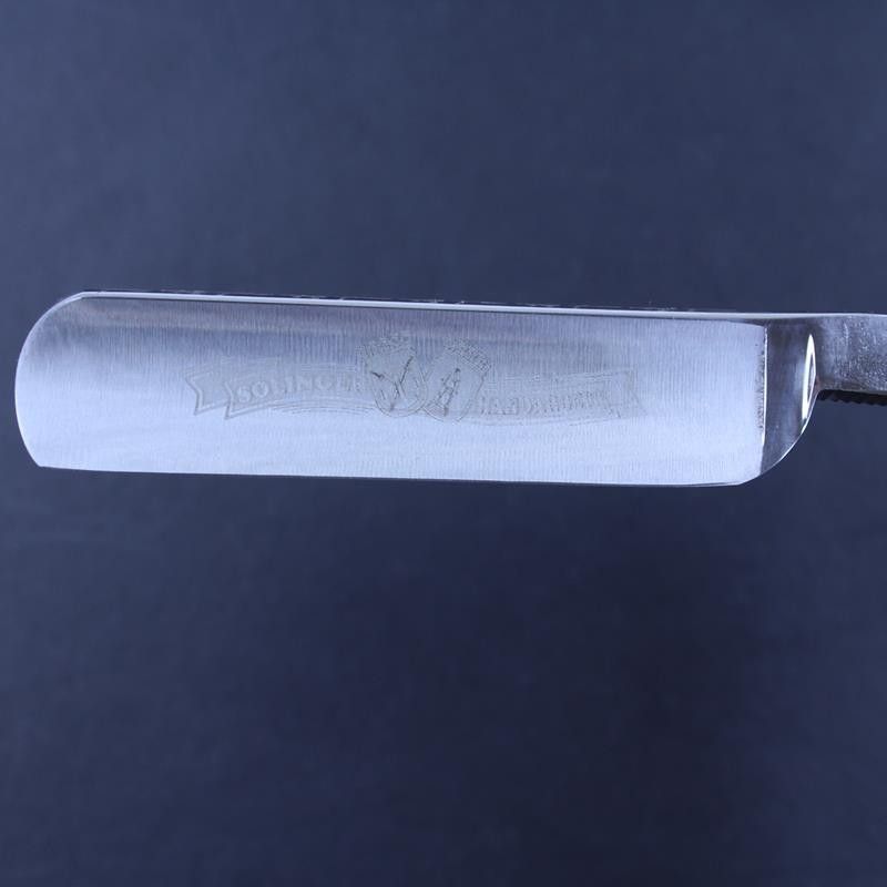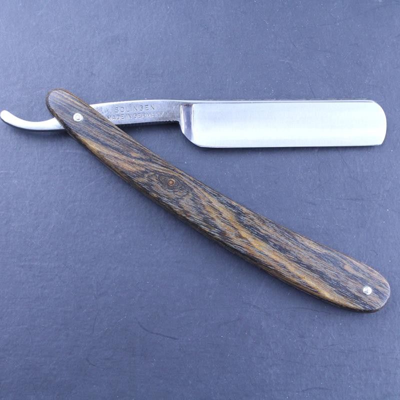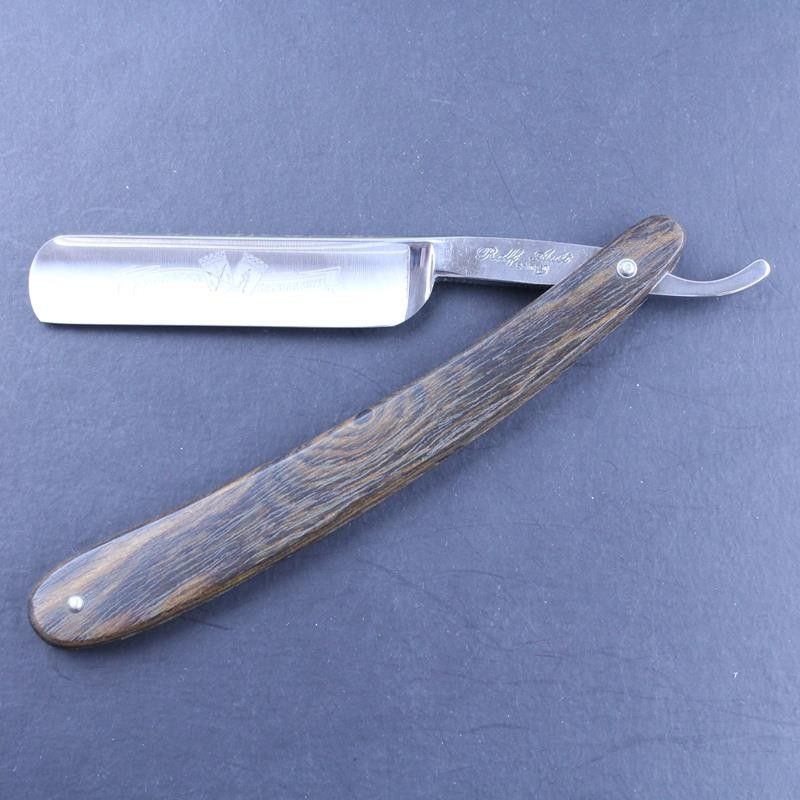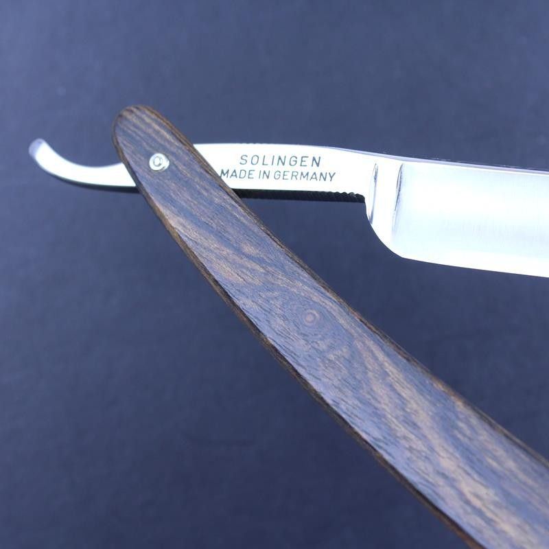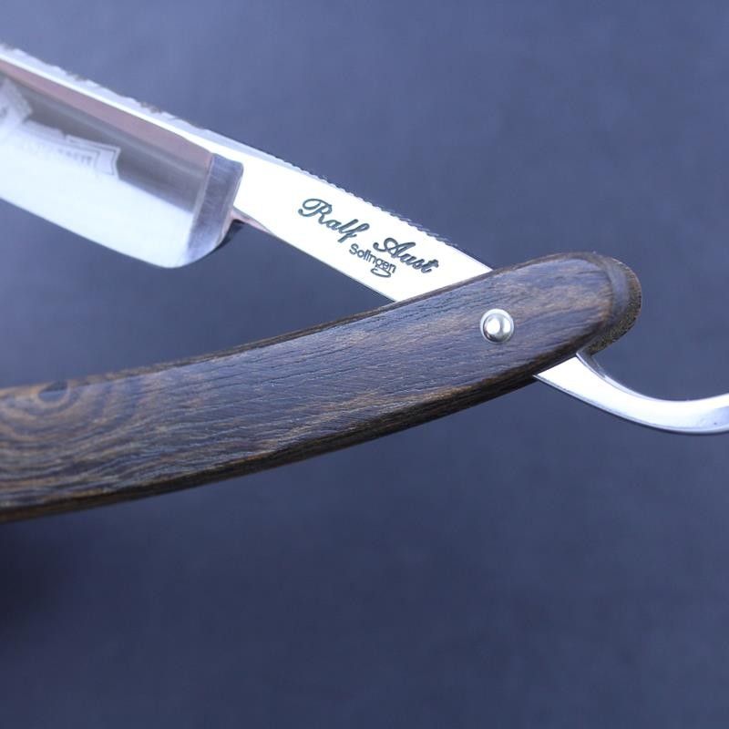 This Ralf Aust razor has a 5/8 carbon steel satin finished round point blade and unusual mexican palisander wood scales. It has the usual “Ralf Aust Solingen” mark on the tang and the “Solingen Handarbeit” – handmade in Solingen – mark on the blade. Mexican palisander is a tropical hardwood similar to rosewood, but dark brown in colour. It has a beautiful grain marked with darker brown stripes. The scales feel substantial and the wood itself has a smooth but oiled texture. The spine has a flower pattern laser etched on to the top – something we have added to some of the razors which make up our expanded Ralf Aust range. The tang has jimping to the upper and lower tang. All Ralf Aust razors have a full hollow ground blade.