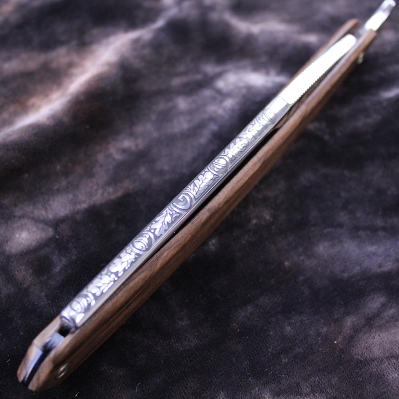 The scales are made from walnut – a wood which has a rich brown colouration and grain marking – which has previously proved to be a popular choice. These together with the spine design make this razor something a little special.