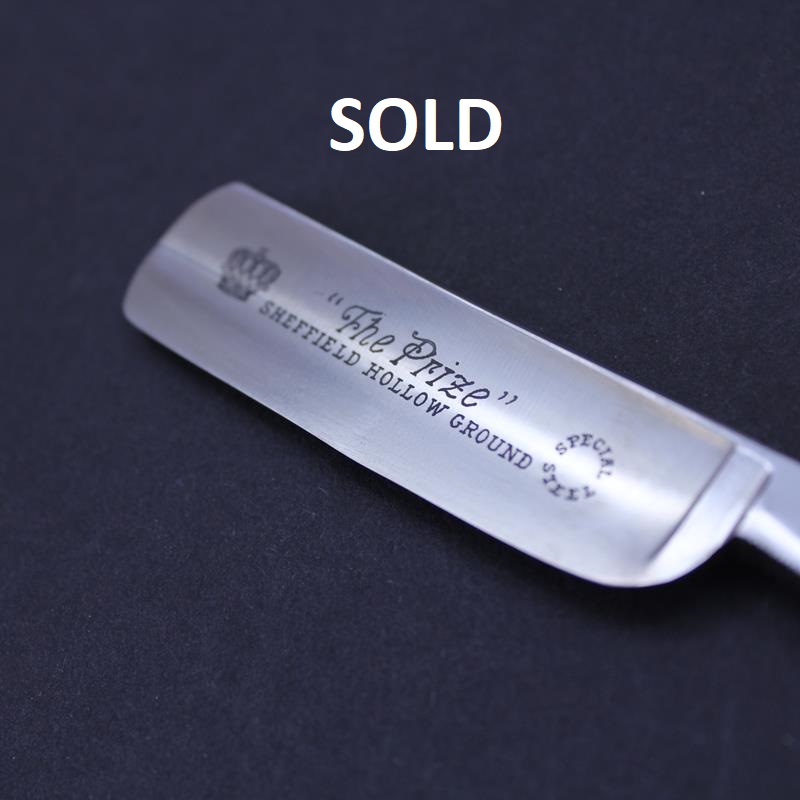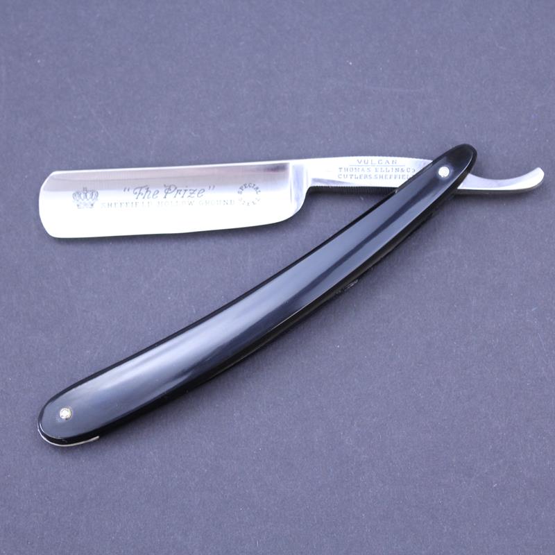 A Thomas Ellin & Co Vintage Vulcan razor from this Sheffield maker bearing the blade marking “The Prize”. The razor is a 6/8 size and in excellent condition. This Thomas Ellin & Co Vintage Vulcan razor has jimping to the upper and lower tang and has a plain spine. My guess at age would be around the 1940s.