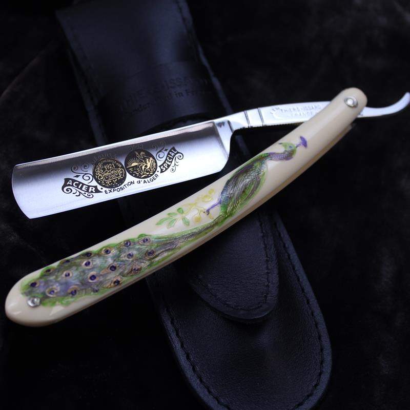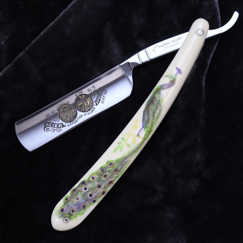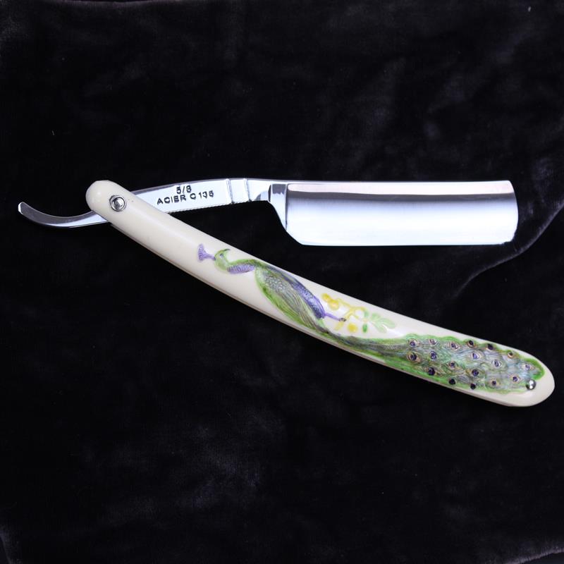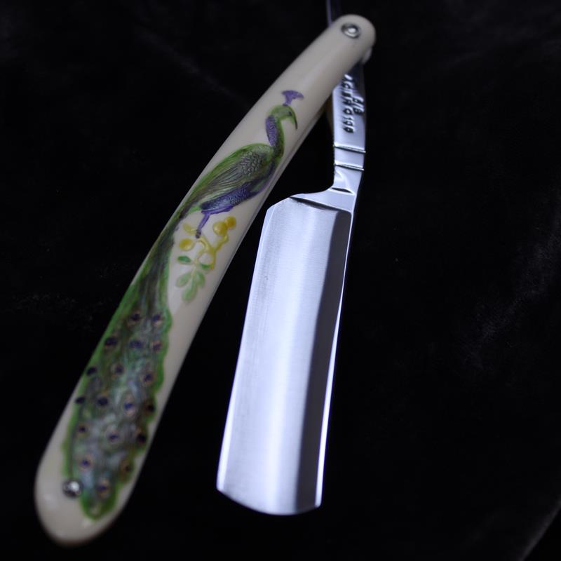 This TI 5/8 Medaille D’or Peacock Razor is a modern take on a vintage style razor. It has ivory coloured moulded composite scales with a painted peacock covering the length. Unusually this design appears on both sides of the scales. We have sold razors with moulded scales before but these have been vintage razors dating from the early 20th Century.