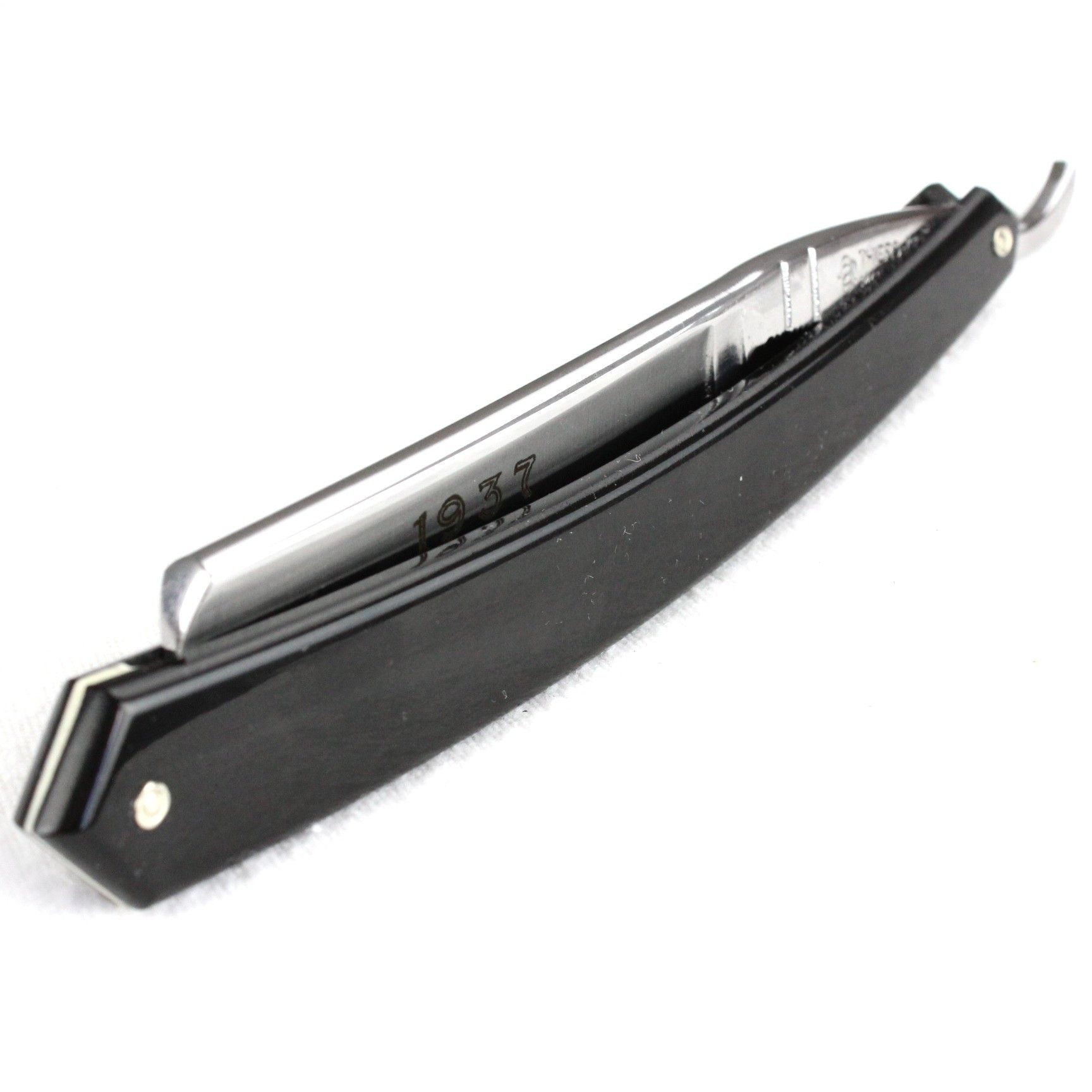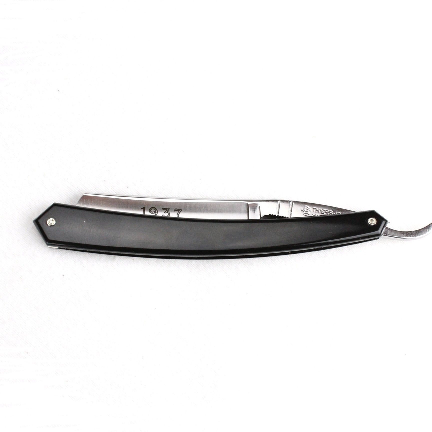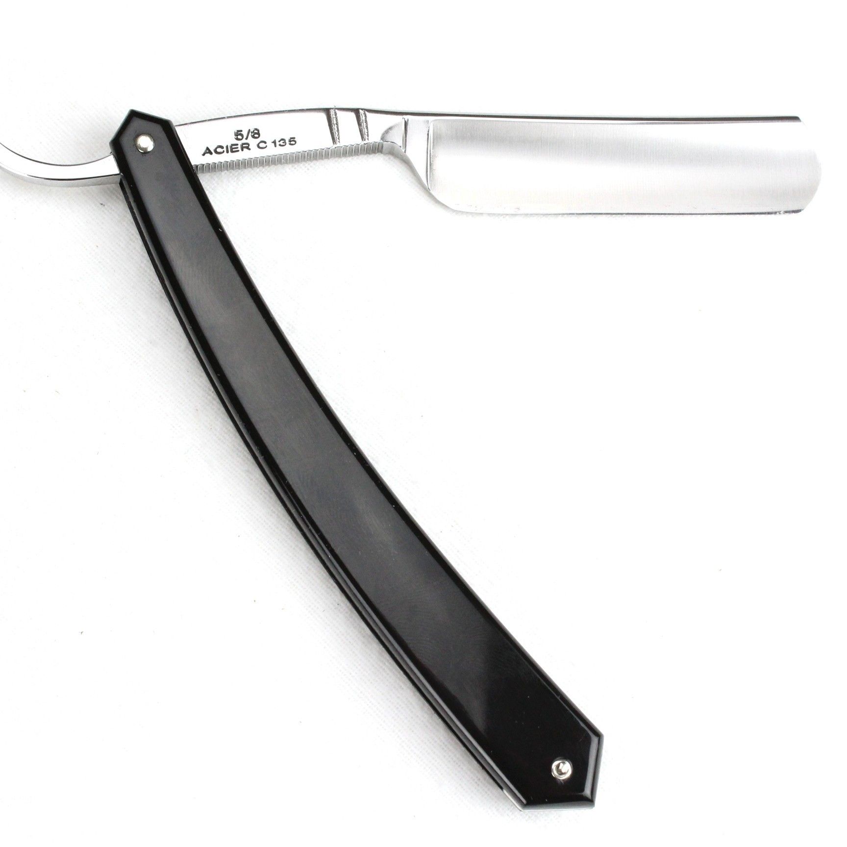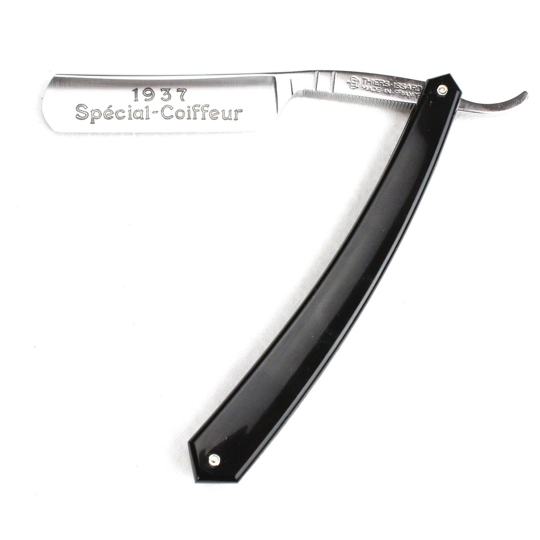 The Special Coiffure Razor from Thiers Issard is an excellent introduction to the world of straight shaving being a relatively lightweight razor with a half-hollowed blade. This version has a 5/8 round point blade which is nicely etched with both sides satin polished and anti-slip jimping to the underside of the tang. The scales are of black plastic. Supplied in a simple black sheep leather pouch.
