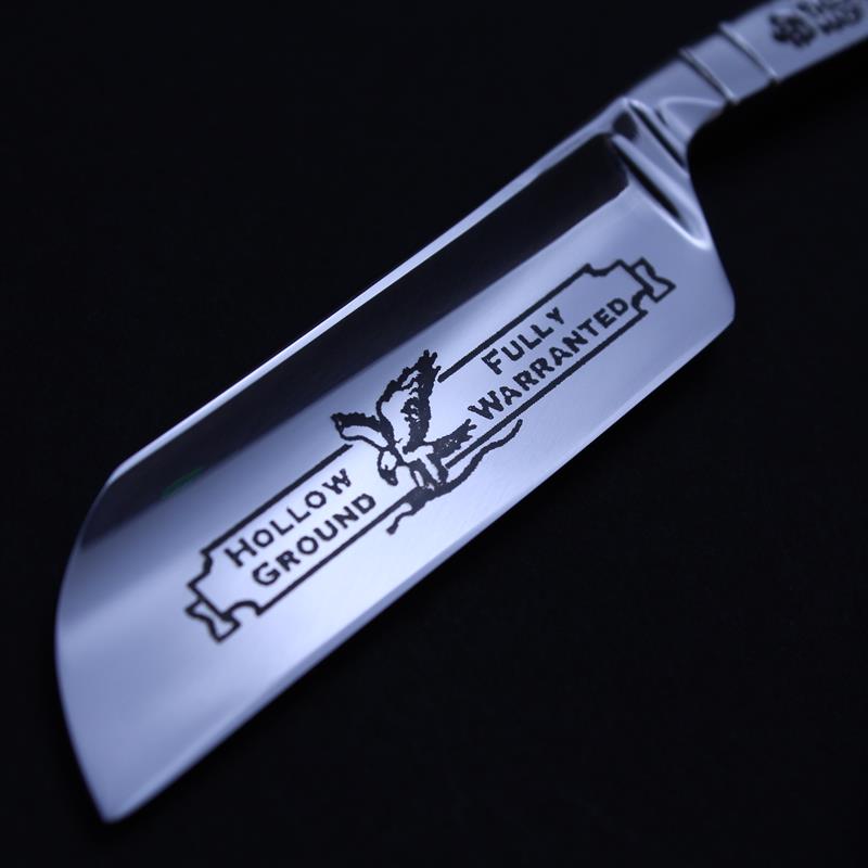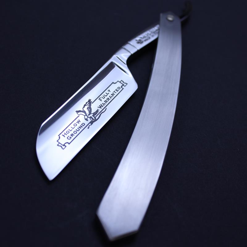 This TI 6/8 Razor with Stainless Steel Scales is a new variation to us. It has a mirror finish blade with the eagle mark in black, a plain spine, a french nose and jimping to the upper and lower tang. I think you will agree the combination produces a stunning simple, yet impressive razor.