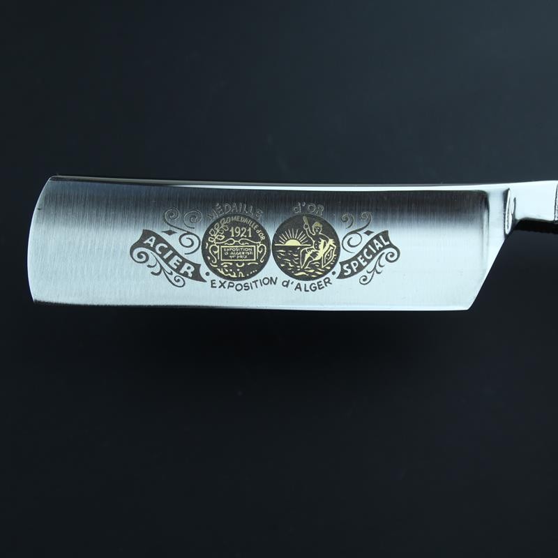 We have had these razors before from Thiers Issard and they have proved popular so we have stocked a new version, this time with  blonde horn scales. The image shows pale honey coloured scales with darker brown stripes but blonde horn can equally come entirely in paler honey colours. The razor has a 6/8 carbon steel blade which bears the Medaille D’or Exposition D’Alger mark on the blade in black with gold detailing, a satin finish to both side and jimping to the lower spine whilst the spine itself is plain.