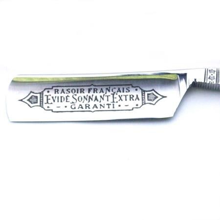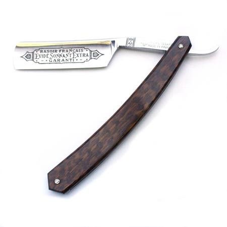 Snakewood is very attractive material which, not surprisingly, looks similar to the skin marking of some snakes. It certainly makes for a very attractive razor, and here it complements a Thiers-Issard 6/8 singing hollowed blade bearing the Evide Sonnant Extra marking in black on a satin finished blade. The blade has jimping to the lower side of the tang and a plain spine.