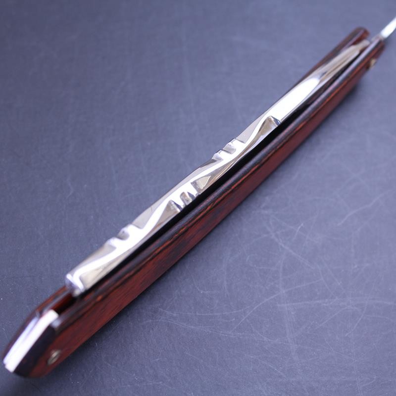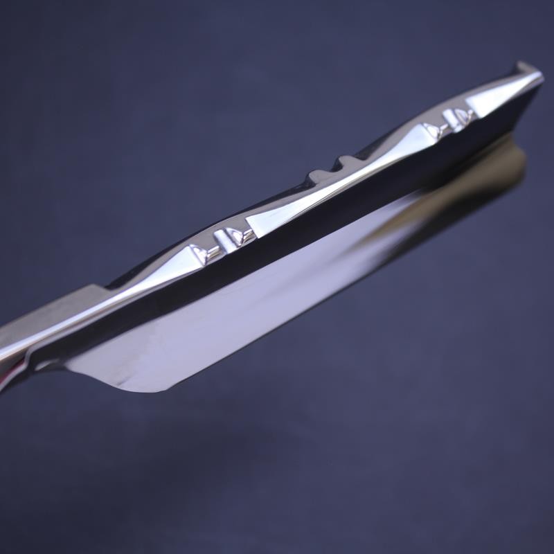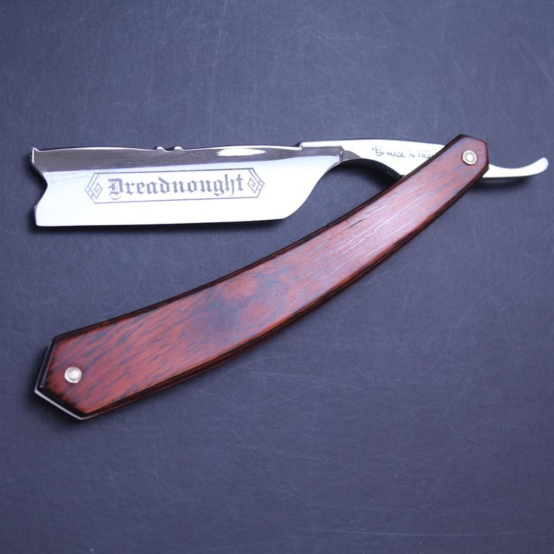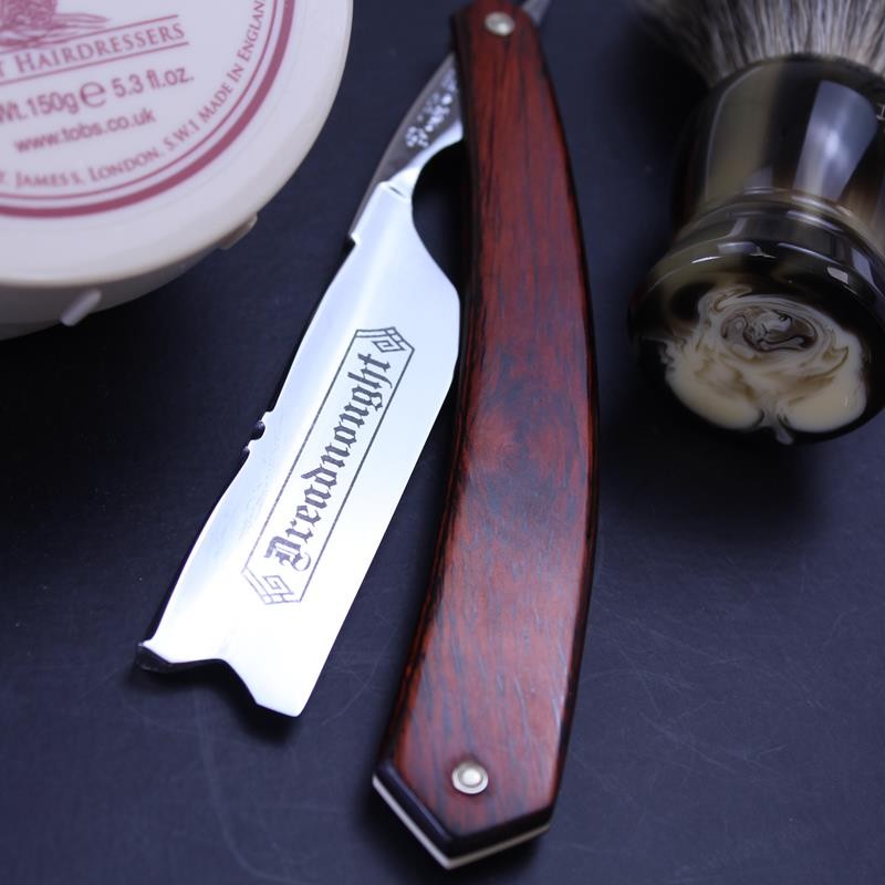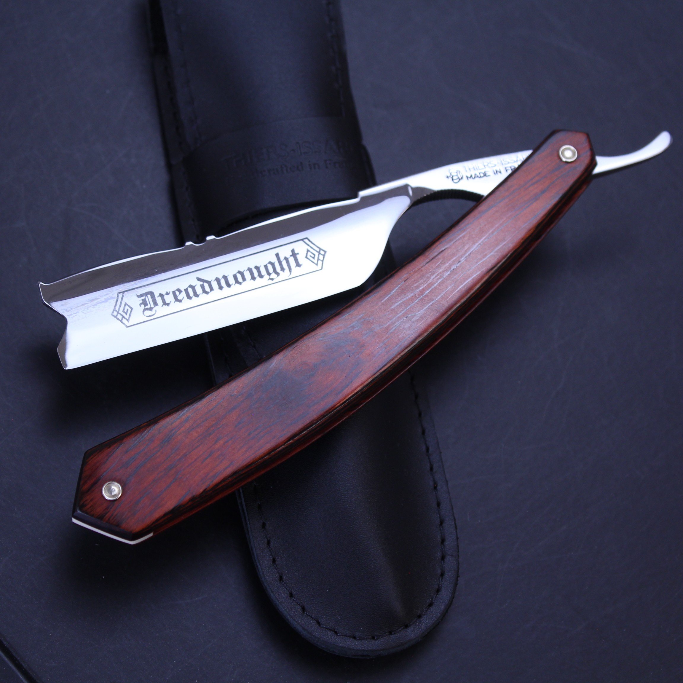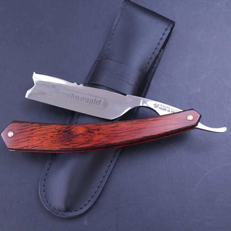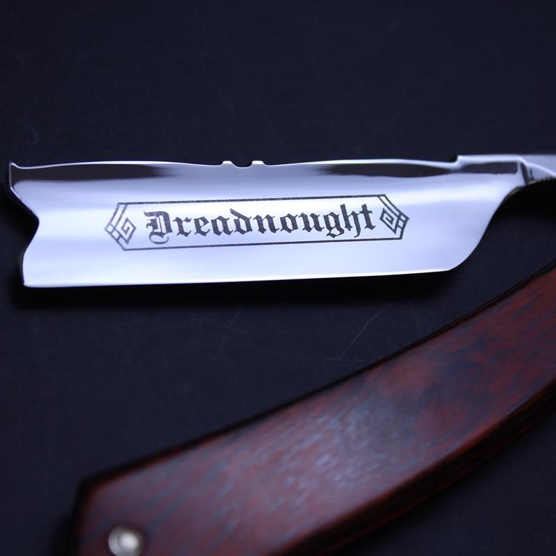 A large and impressive razor, this TI 7/8 red stamina flower spine hook nose razor sports attractive scales made from a rosewood or beech laminate. Maufactured by Thiers-Issard, the popular flower design to the spine is hand worked and dates back to the 19th Century. The razor has a hook nose point and mirror finish to both sides of the blade. The Dreadnought ® marking is exclusive to us so you won’t find this razor anywhere else.