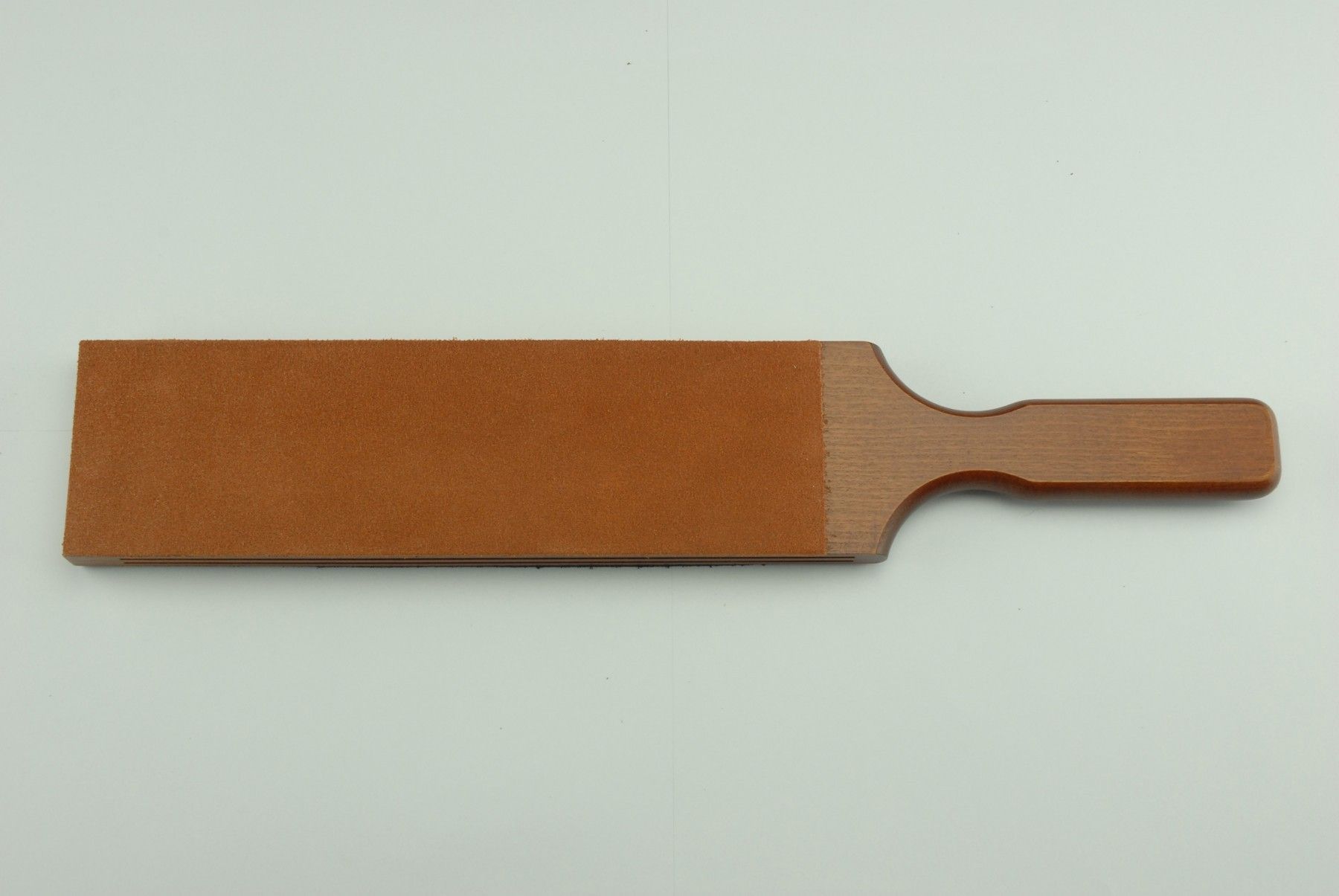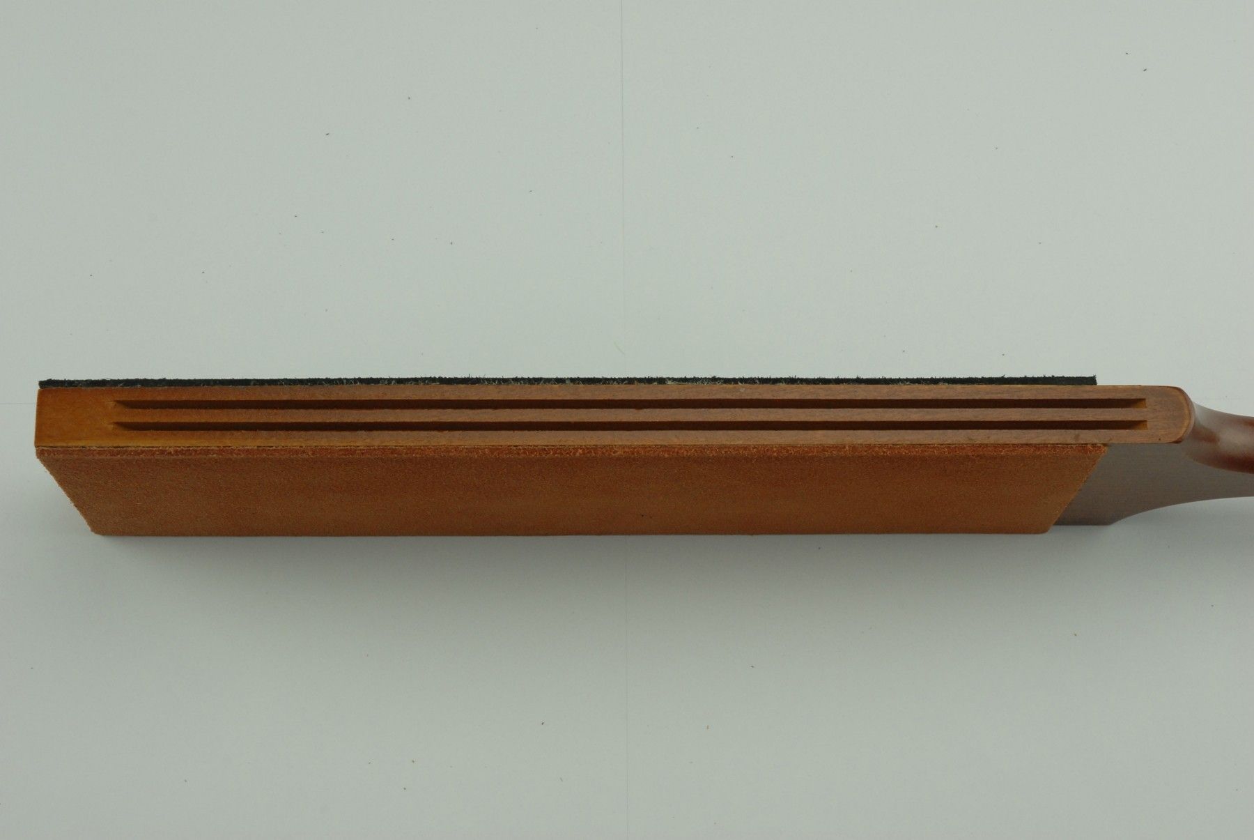 This is an extra wide paddle strop from Thiers Issard which has napped leather on both sides. It has napped leather on both sides and cuts through providing a sprung effect. The beds are approx. 76 x 250 mm.