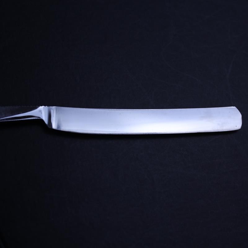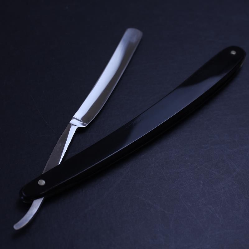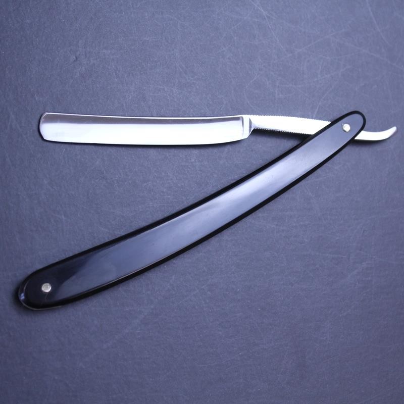 The razor has a thick grind, a round point and jimping to the upper and lower tang and black scales, which we believe to be Bakelite. The scales are larger than the blade so there is a gap between the point of the blade and the spacer in the scales. While the razors came to me in very good condition, the odd one had a bit of corrosion on the spine or tang which I have removed. If you are interested in a small Sheffield razor then this would be a great buy.